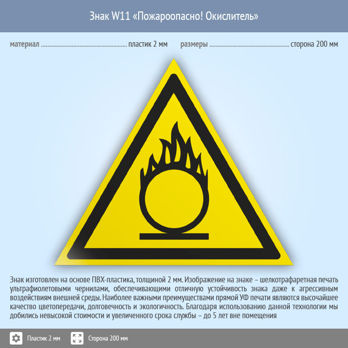 Знак W11 «Пожароопасно! окислитель» на пластике, размером стороны 200 мм сообщает, что здесь находится окислитель и это вполне пожароопасно. Предупреждающие знаки безопасности изготовлены согласно ГОСТ Р 12.4.026-2015 и предназначены для предупреждения людей о возможной опасности