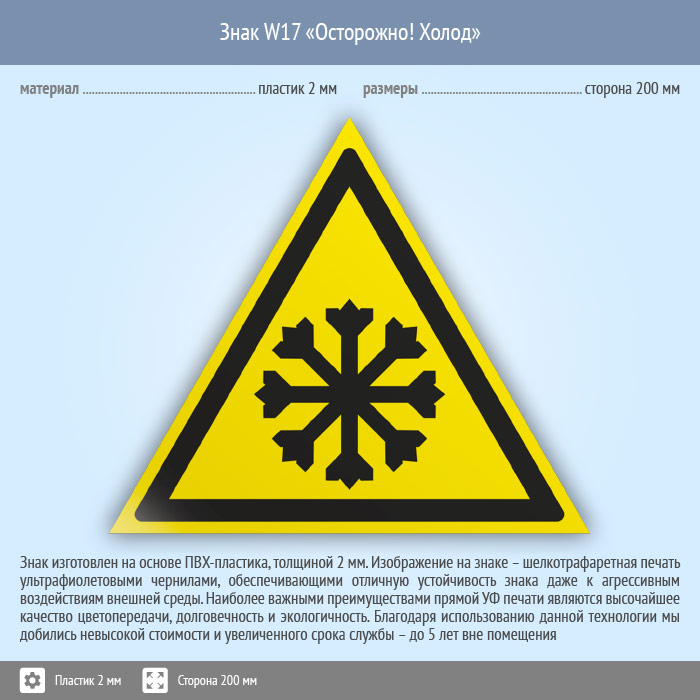 Знак W17 «Осторожно! холод» (пластик, сторона 200 мм)