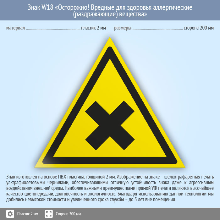 Знак W18 «Осторожно! вредные для здоровья аллергические (раздражающие) вещества» на пластике, размером стороны 200 мм предупреждает о наличии в воздухе вредных для здоровья веществ. Предупреждающие знаки безопасности изготовлены согласно ГОСТ Р 12.4.026-2015 и предназначены для предупреждения людей о возможной опасности