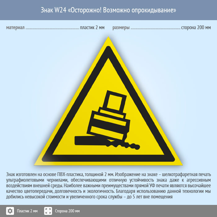 Знак W24 «Осторожно! возможно опрокидывание» на пластике, размером стороны 200 мм предупреждает, что в любой момент на Вас сверху может что-то упасть. Предупреждающие знаки безопасности изготовлены согласно ГОСТ Р 12.4.026-2015 и предназначены для предупреждения людей о возможной опасности