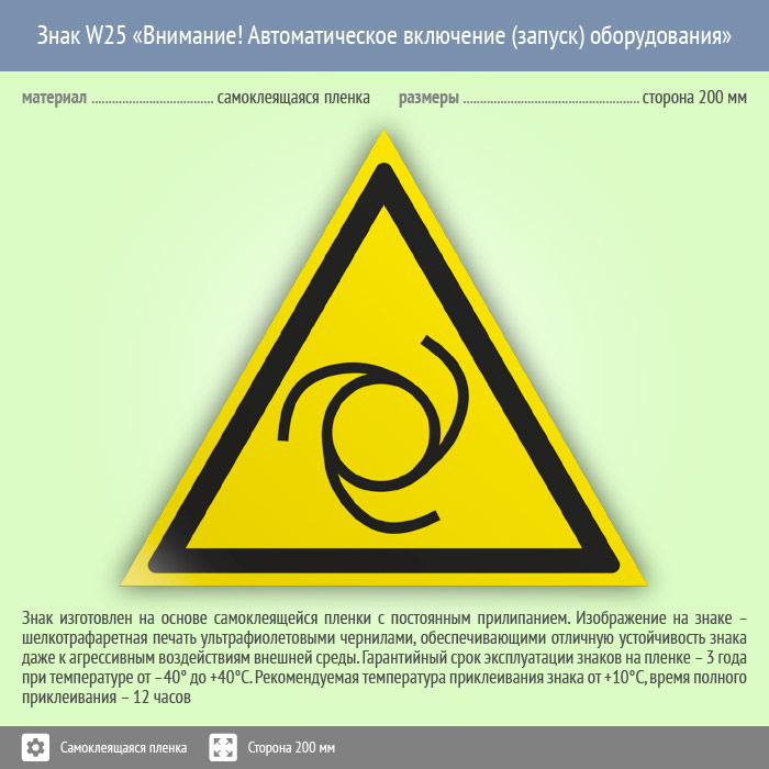Знак W25 «Внимание! автоматическое включение (запуск) оборудования» на пленке, размером стороны 200 мм предупреждает об автоматическом запуске установки или оборудования. Предупреждающие знаки безопасности изготовлены согласно ГОСТ Р 12.4.026-2015 и предназначены для предупреждения людей о возможной опасности
