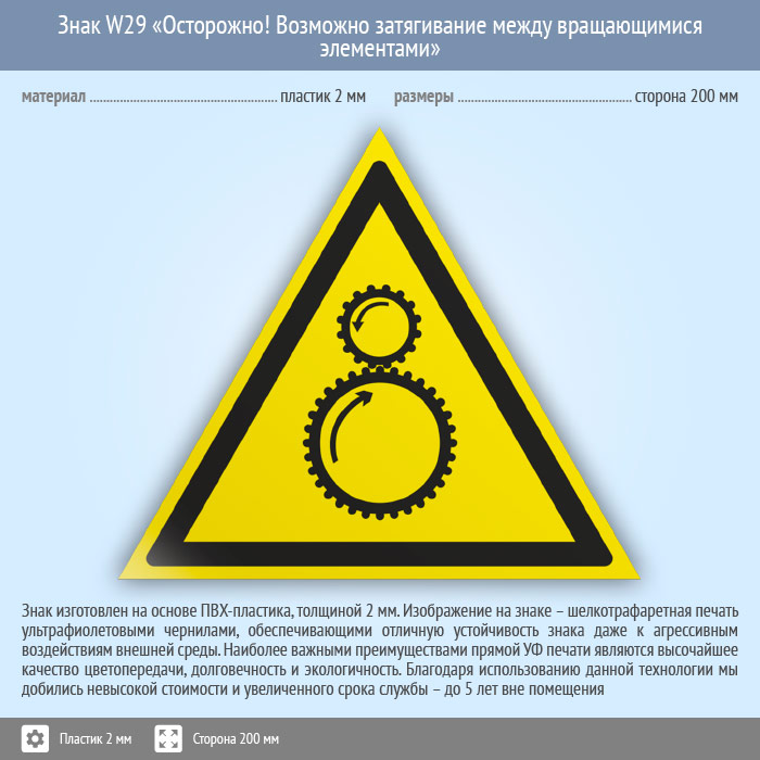 Знак W29 «Осторожно! возможно затягивание между вращающимися элементами» (пластик, сторона 200 мм)