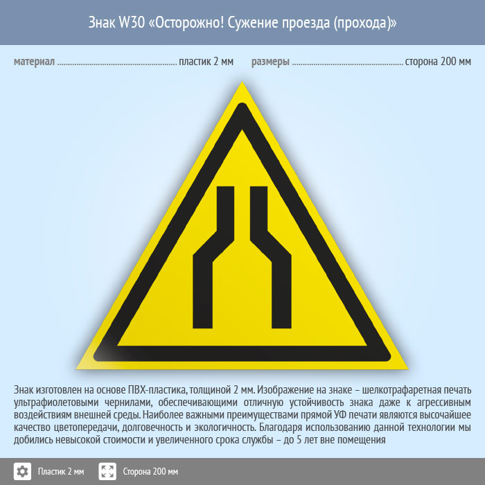 Знак W30 «Осторожно! сужение проезда (прохода)» на пластике, размером стороны 200 мм размещают в местах сужения проезжей части. Предупреждающие знаки безопасности изготовлены согласно ГОСТ Р 12.4.026-2015 и предназначены для предупреждения людей о возможной опасности