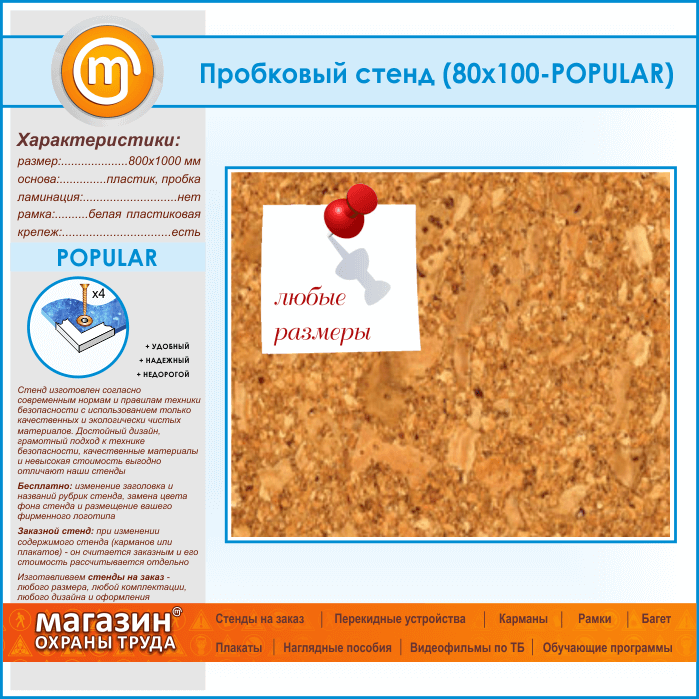 Пробковая доска, размером 100х80 см – отличное решение для размещения сменной информации. Основное достоинство пробковой доски – это оперативная и удобная смена информации, ведь вам понадобятся только руки и канцелярские кнопки. Еще одним несомненным плюсом является возможность использования любого формата бумаги, чего не скажешь о карманах. Часто на таких стендах размещают контактные данные, образцы заполняемых бланков, график работы, порядок приема документов в организации и прочее