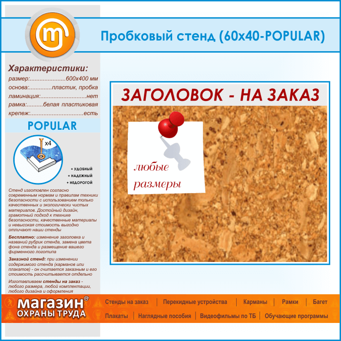 Пробковая доска с заголовком, размером 60х40 см – отличное решение для размещения сменной информации. Основное достоинство пробковой доски – это оперативная и удобная смена информации, ведь вам понадобятся только руки и канцелярские кнопки. Еще одним несомненным плюсом является возможность использования любого формата бумаги, чего не скажешь о карманах. Часто на таких стендах размещают контактные данные, образцы заполняемых бланков, график работы, порядок приема документов в организации и прочее
