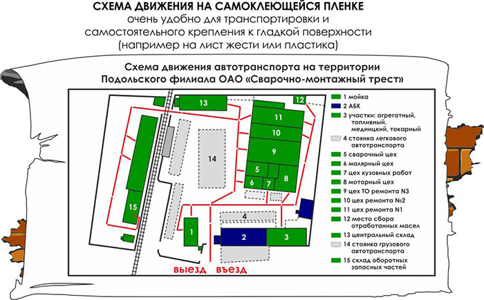 Материал: Схема изготовлена из ПВХ-пленки, которую, при небольшом навыке, не трудно приклеить на гладкую подготовленную поверхность. Пленка предназначена для использования на улице: не боится света и воды. Полимерные самоклеящиеся пленки превосходят другие материалы по адгезии и морозоустойчивости, поэтому схемы изготовленные с их применением, долго сохраняют свой внешний вид
