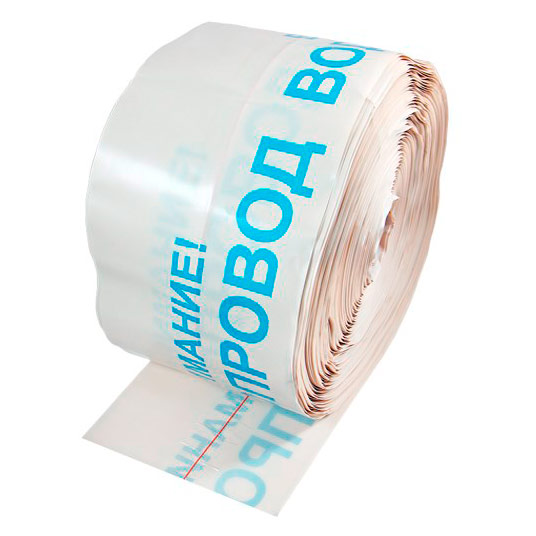 Сигнальная детекционная лента для водопроводов. Лента белого цвета имеет надпись «Внимание Водопровод». Полоса белого цвета достаточно плотная для эксплуатации изделия на протяжении нескольких десятилетий. Дополнительно предусмотрена защита от истирания. Лента оснащена проводником, который проходит по всей длине намотки.