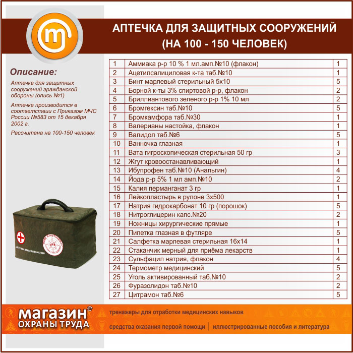 АПТЕЧКА ДЛЯ ЗАЩИТНЫХ СООРУЖЕНИЙ (НА 100 – 150 ЧЕЛОВЕК)
