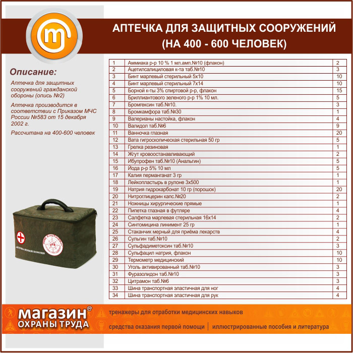 АПТЕЧКА ДЛЯ ЗАЩИТНЫХ СООРУЖЕНИЙ (НА 400 – 600 ЧЕЛОВЕК)