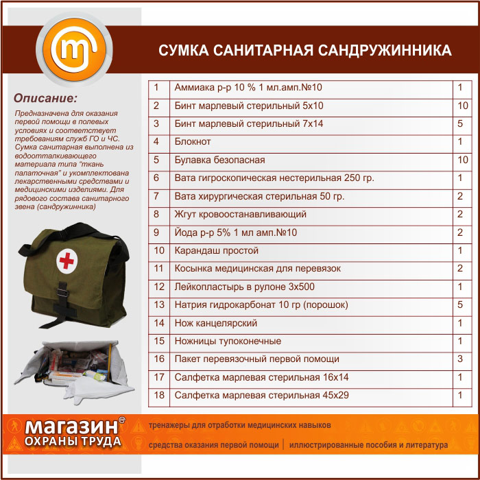 Предназначена для оказания первой помощи в полевых условиях и соответствует требованиям служб ГО и ЧС. Сумка санитарная выполнена из водоотталкивающего материала типа “ткань палаточная” и укомплектована лекарственными средствами и медицинскими изделиями. Для рядового состава санитарного звена (сандружинника)