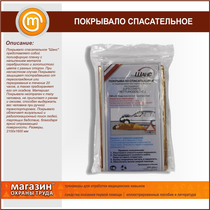 Покрывало спасательное "Шанс" представляет собой полиэфирную пленку с напылением металла серебристого и золотистого цвета с разных сторон. При несчастном случае Покрывало защищает пострадавшего от переохлаждения или перегревания в течение 20 часов, а также предохраняет его от осадков. Материал Покрывала нейтрален к телу человека, не прилипает к ранам и ожогам, способен выдержать вес человека при ручной транспортировке. Покрывало облегчает визуальный и радиолокационный поиск людей, терпящих бедствие, благодаря яркой отражающей поверхности. Размеры, 2100x1600 мм