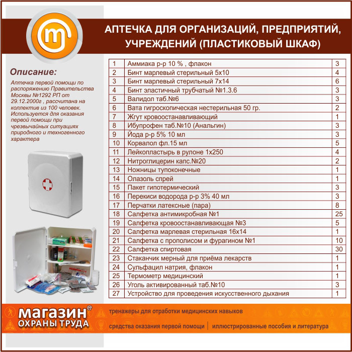 Аптечка первой помощи по распоряжению Правительства Москвы №1292 РП от 29.12.2000г , рассчитана на коллектив из 100 человек. Используется для оказания первой помощи при чрезвычайных ситуациях природного и техногенного характера