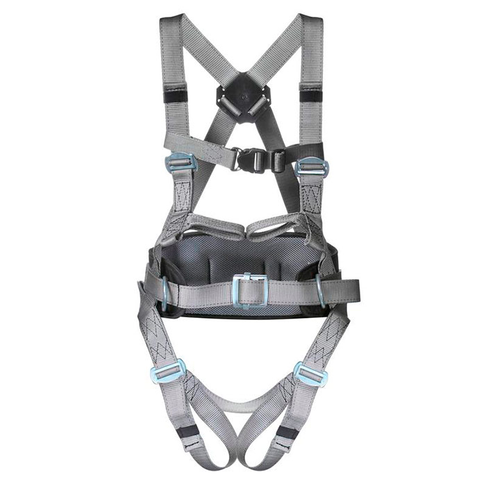 - Пояс имеет четыре элемента крепления: два D-образных элемента крепления по бокам привязи, один на спине и анкерную петлю на груди