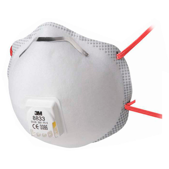 Респиратор 3М 8833 для защиты от пыли и туманов с клапаном выдоха (FFP3, до 50 ПДК). Рекомендуемые области применения: металлургия, строительство, машиностроение, судостроение, керамические производства, литейные производства, производство кирпича, лесопильные предприятия, работа в карьерах и открытых разрезах, фармакология, агрохимия, работа с резиной и пластиком, химические производства, сварочные работы и пайка, производство аккумуляторов