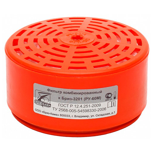 Бриз-3201 (РУ-60) А1В1Е1К1Р1 (комбинированный). Органические газы и пары (бензол, эфиры, бензин, нитросоединения бензола, хлор- и фосфорорганика), неорганические газы и пары (галогены, сероуглерод), кроме окиси углерода, кислые газы и пары (сероводород, сернистый газ, хлористый водород), аммиак, амины, аэрозоль