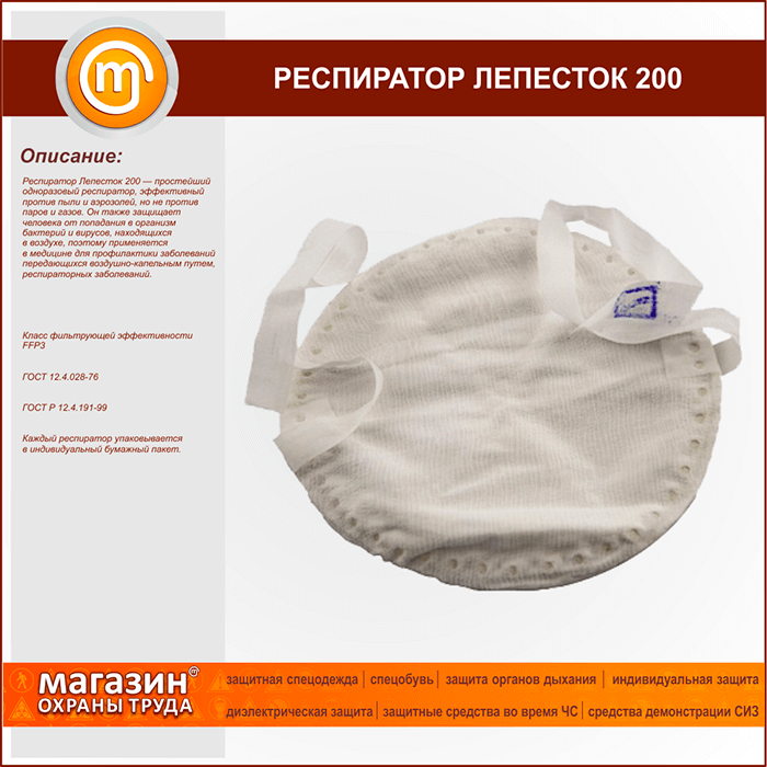 Респиратор Лепесток 200 – простейший одноразовый респиратор, эффективный против пыли и аэрозолей, но не против паров и газов. Он также защищает человека от попадания в организм бактерий и вирусов, находящихся в воздухе, поэтому применяется в медицине для профилактики заболеваний, передающихся воздушно-капельным путем, респираторных заболеваний
