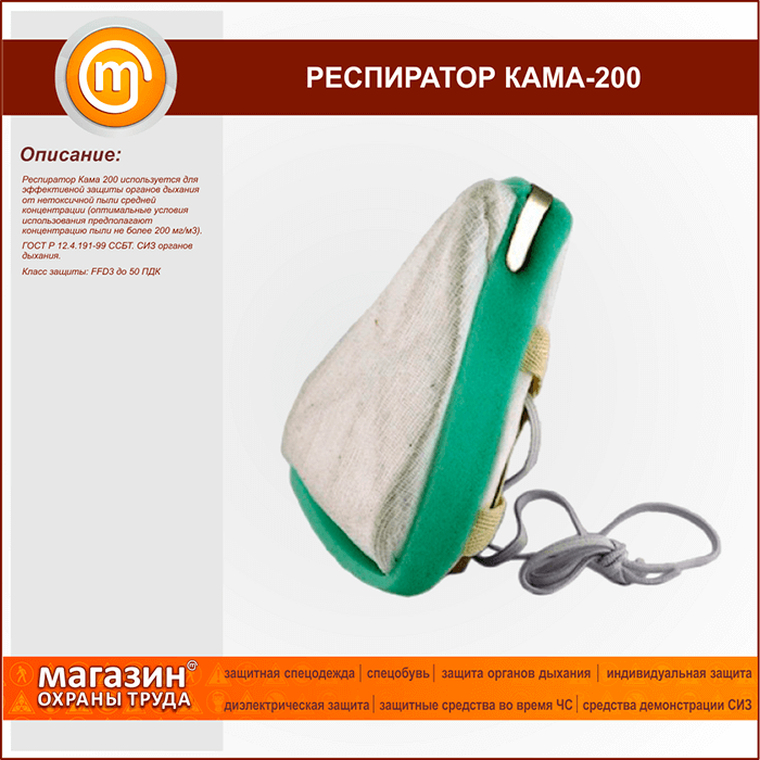 Респиратор Кама 200 используется для эффективной защиты органов дыхания от нетоксичной пыли средней концентрации (оптимальные условия использования предполагают концентрацию пыли не более 200 мг/м3)