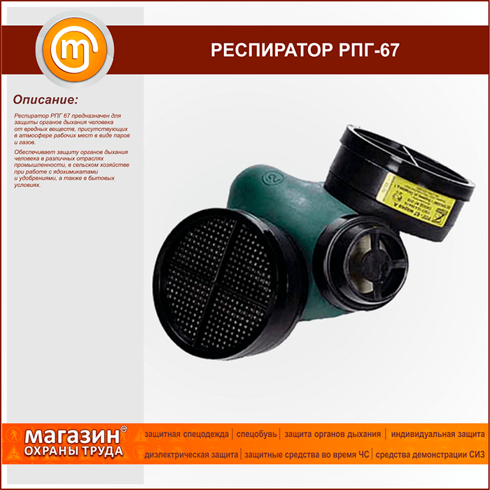 Респиратор «РПГ-67В1» предназначен для защиты органов дыхания от неорганический вредных паров и газов (галогены, сероуглерод, кроме окиси углерода), присутствующих в воздухе рабочих зон производственных помещений в концентрациях, не превышающих предельно допустимые нормы более чем в 10 раз