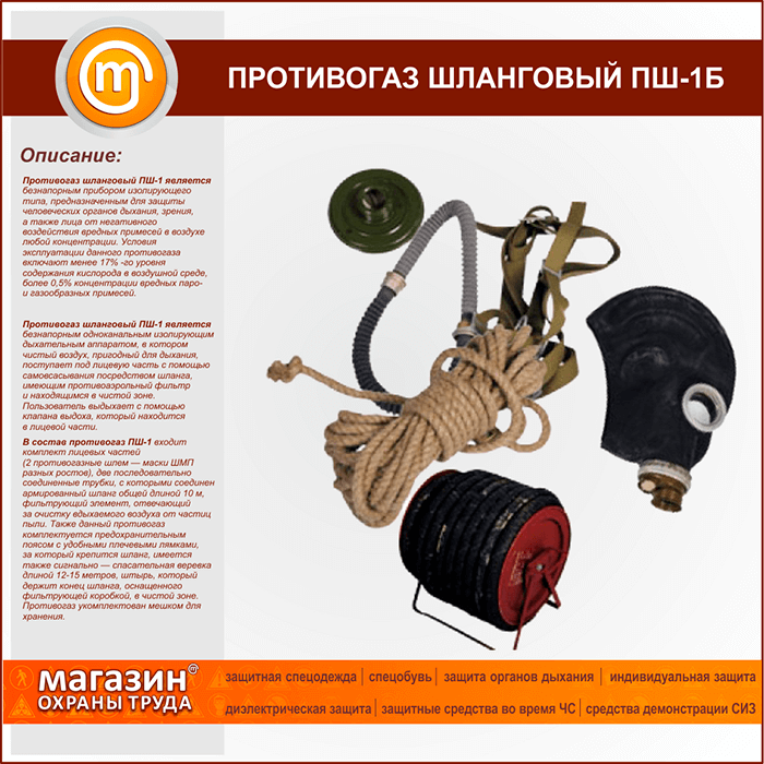 Противогаз шланговый ПШ-1 является безнапорным прибором изолирующего типа, предназначенным для защиты человеческих органов дыхания, зрения, а также лица от негативного воздействия вредных примесей в воздухе любой концентрации. Условия эксплуатации данного противогаза включают менее 17% -го уровня содержания кислорода в воздушной среде, более 0,5% концентрации вредных паро- и газообразных примесей