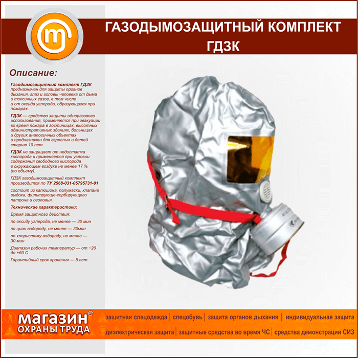 ГДЗК – средство защиты одноразового использования, применяется при эвакуации во время пожара в гостиницах, высотных административных зданиях, больницах и других аналогичных объектах и предназначен для взрослых и детей старше 10 лет