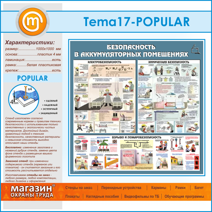 Стенд «Аккумуляторные помещения» – это безопасность в картинках: электробезопасность – правила работы с аккумуляторами, химическая безопасность – приготовление электролита, взрыво- и пожаробезопасность – вентиляция, освещение и эксплуатация аккумуляторных помещений…