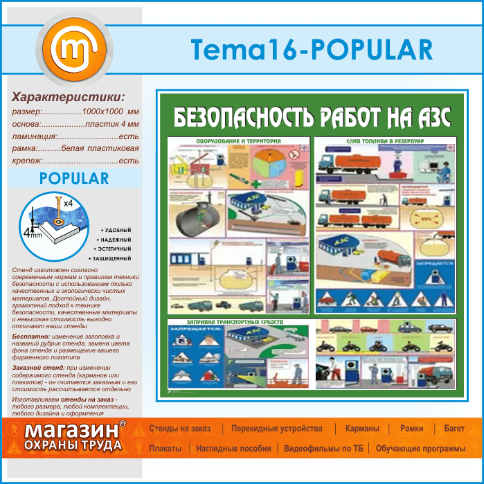 Стенд «Безопасность работ на автозаправочных станциях» – необходимая информация на любой заправочной станции: обслуживание и территория – уход и содержание; слив топлива в резервуар – порядок действий и техника безопасности; заправка транспортных средств – подача автомобиля и правила поведения на заправке…
