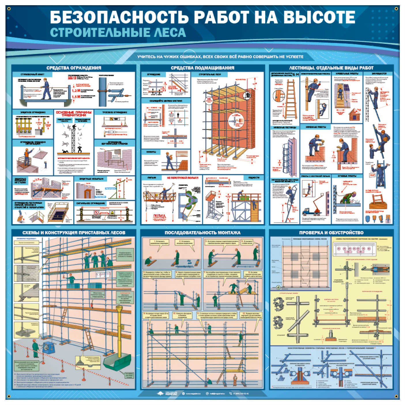 Стенд «Безопасность работ на высоте. Строительные леса» – это полноценная информация по технике безопасности при выполнении строительных или ремонтных работ на высоте. На стенде рассмотрены средства ограждения и подмащивания, лестницы и отдельные виды работ. Более подробно на данном стенде рассмотрены строительные леса: схема и конструкция притавных лесов, последовательность монтажа, проверка и обустройство – техника безопасности при монтаже и работе на них