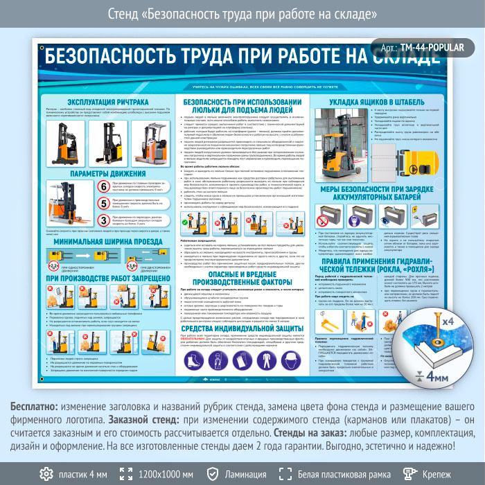 Стенд «Безопасность труда при работе на складе» (TM-44) содержит информацию о безопасной работе на складе.