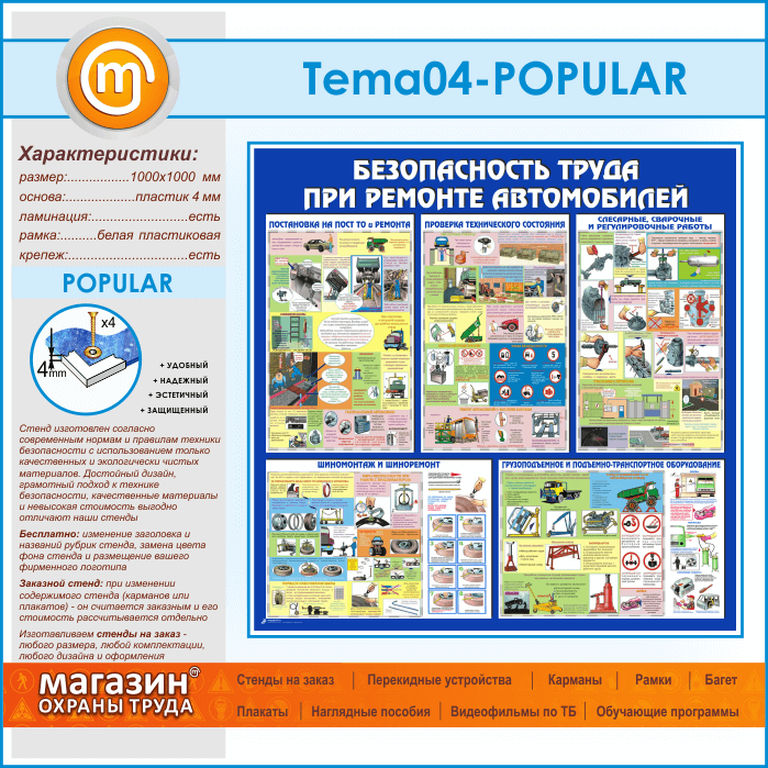 Стенд «Безопасность труда при ремонте автомобилей» – необходимая информация в каждой автомастерской: постановка на пост ТО и ремонта, проверка технического состояния, слесарные сварочные и регулировочные работы, шиномонтаж и шиноремонт, грузоподъемное и подъемно-транспортное оборудование…