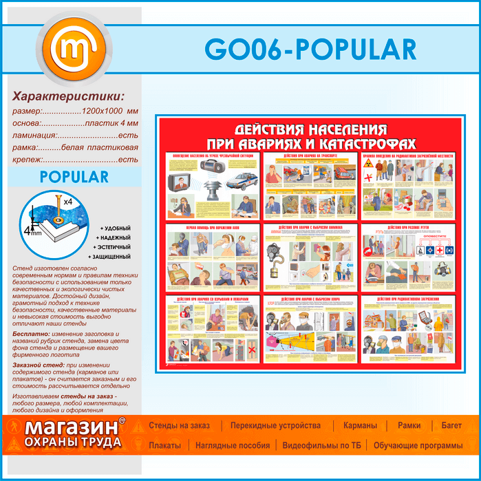Стенд «Действия населения при авариях и катастрофах» – яркое наглядное пособие, обучающее действиям при авариях на транспорте и авариях с выбросом аммиака, правилах поведения на радиоактивно загрязненной местности и действиях при разливе ртути. Научит Вас, как действовать при авариях со взрывами и пожаром, с выбросом хлора, напомнит о средствах оповещения населения в случае угрозы чрезвычайной ситуации…