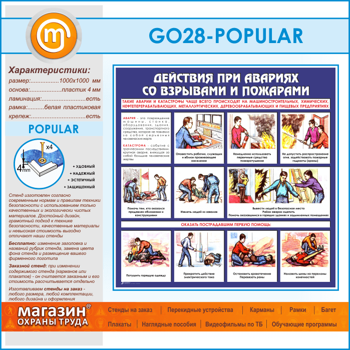 Стенд «Действия при авариях со взрывами и пожарами» – такие аварии и катастрофы чаще всего происходят на машиностроительных, химических, нефтеперерабатывающих, металлургических, деревообрабатывающих и пищевых предприятиях – оповещение, действия во время и после пожара, оказание пострадавшим первой помощи…