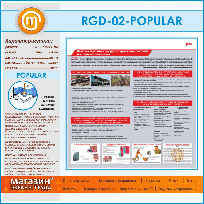 Стенд с действиями работников РЖД при угрозе террористического акта и в случае его совершения – это важная информация и ежедневное напоминание о возможных средствах и методах осуществления террористических актов, о мерах предупредительного характера, рекомендуемые предприятиям и организациям ОАО «РЖД» в целях предотвращения террористических актов. Также на стенде размещена информация о задачах формирований гражданской обороны ОАО «РЖД» по применению и ликвидации чрезвычайных ситуаций, обусловленных террористическими актами и профилактический осмотр территорий и помещений объектов железнодорожного транспорта
