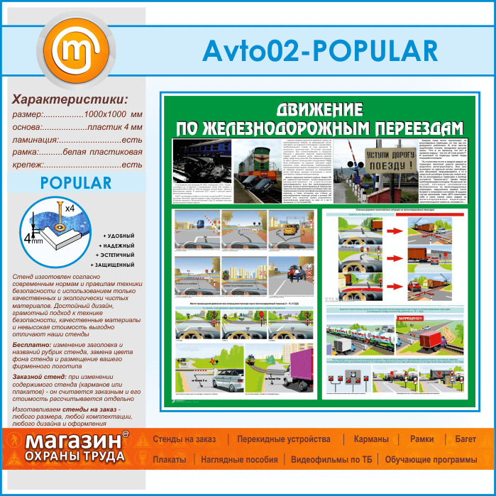 На стенде по обучению правилам движения через железнодорожный переезд отображена информация о правилах переезда: обязанности водителей перед и на переездах, действия при вынужденной остановки на переезде, режим движения на переезде, сигналы светофора, а также информация о знаках, используемых в непосредственной близости к переезду