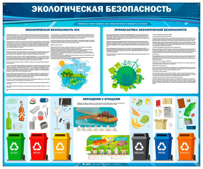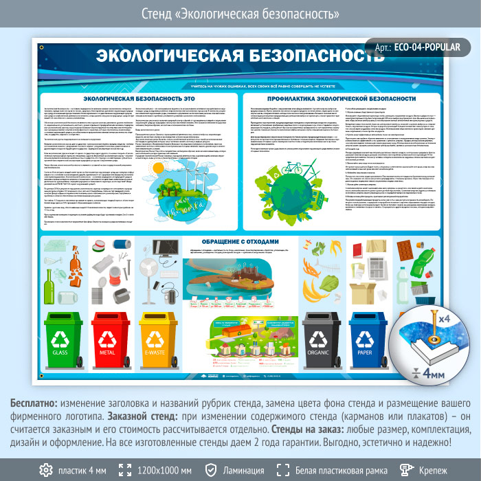 Стенд «Экологическая безопасность» (ECO-04) содержит информацию о профилактике и определении экологической безопасности, а также правильному обращению с отходами.