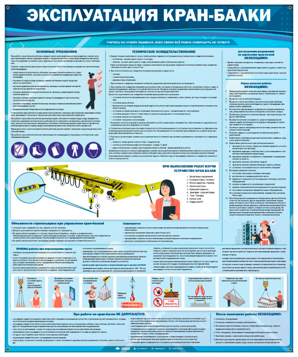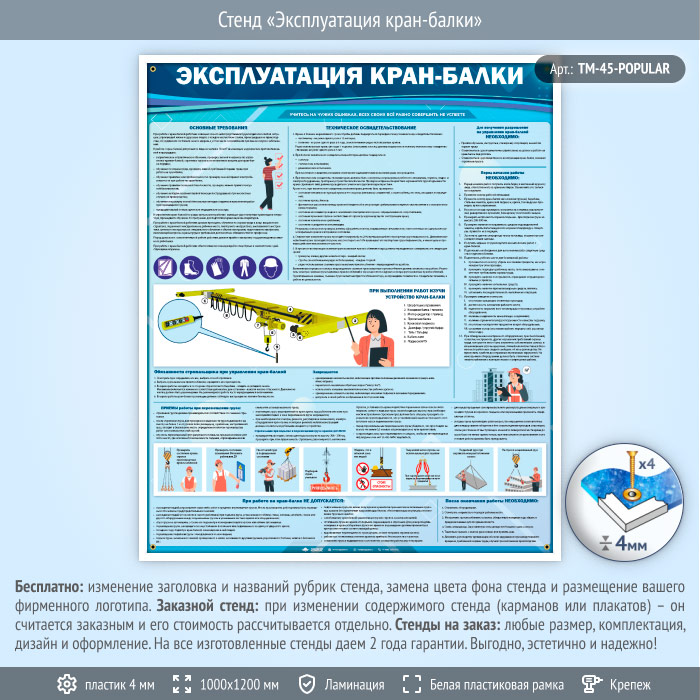 Стенд «Эксплуатация кран-балки» (TM-45) содержит информацию об основных требованиях эксплуатации кран-балки, о ее техническом освидетельствовании, об устройстве кран-балки, о том, что необходимо для получения разрешения на управление кран-балкой, о действиях перед началом работы, об обязанностях стропальщика, о приемах работы при перемещении груза, о том, что не допускается при работе на кран-балке и о том, что необходимо сделать после окончания такой работы.
