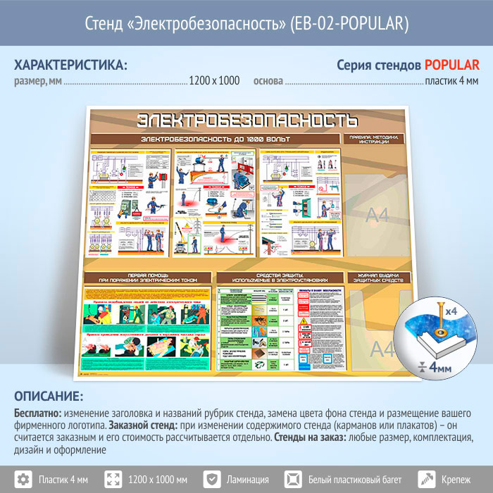 Стенд «Электробезопасность до 1000 вольт» содержит полную информацию об опасностях однофазных и двухфазных прикосновений, научит правильно переключать и заземлять электроустановки, напомнит о 3-х основных правилах перед началом работ. В стенде приведен краткий перечень необходимых средств защиты – внешний вид, сроки эксплуатации и нормы испытаний, а также все необходимые знаки, используемые при работе с электрооборудованием. Стенд содержит информацию о первой помощи при поражении электрическим током – правила освобождения человека от действия тока и правила проведения искусственного дыхания и наружного массажа сердца. Плоский карман предназначен для размещения информации на стенде о правилах, методиках и инструкциях по электробезопасности, объемный карман рассчитан для размещения в нем журнала выдачи защитных средств