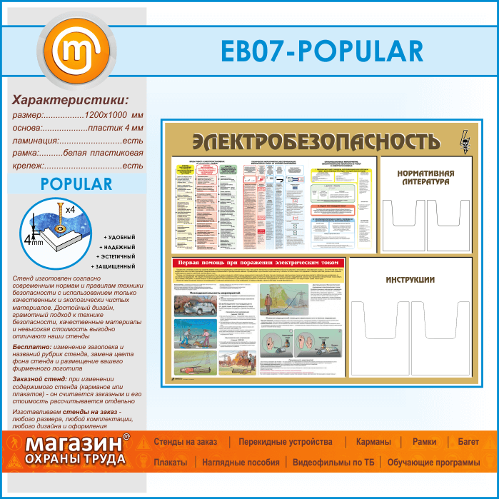 На стенд «Электробезопасность» в виде таблиц и схем отображена информация о видах работ в электроустановках, технические мероприятия, обеспечивающие безопасность работ, связанных со снятием напряжения. Описаны организационные мероприятия, обеспечивающие безопасность работ в электроустановках. На стенде размещена информация об оказании первой помощи при поражении электрическим током – правила освобождения человека от действия тока и проведение искусственного дыхания и наружного массажа сердца. Стенд укомплектован 2 объемными карманами А5 формата для нормативной литературы и 2 объемными карманами для инструкций по электробезопасности