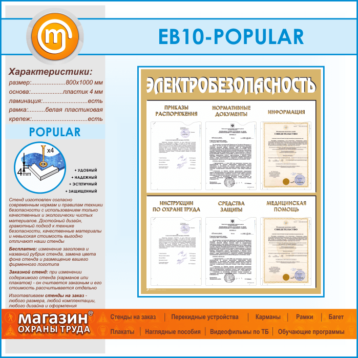 Стенд «Электробезопасность» предназначен для самостоятельного размещения информации на стенде – 6 плоских А4 карманов со следующими рубриками: приказы и распоряжения, нормативные документы, информация, инструкции по охране труда, средства защиты, медицинская помощь