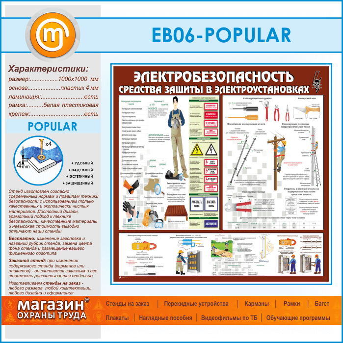 Стенд «Электробезопасность. Средства защиты в электроустановках» – полноформатная информация о необходимых средствах защиты в электроустановках: защитные очки и щитки, диэлектрические перчатки и обувь, изолирующие коврики и подставки, оперативные штанги и изолирующие клещи, знаки безопасности и переносные заземления. Все средства защиты красочно иллюстрированы и имеют полное описания с данными о сроках и правилах использования