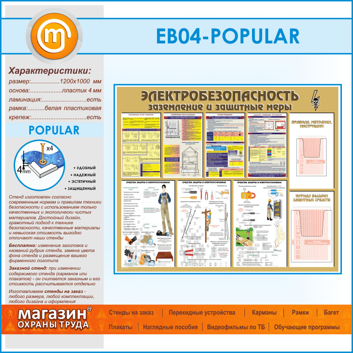 Стенд «Электробезопасность. Заземление и защитные меры» – это стенд с наглядной информацией о классификации систем заземления и формировании систем заземления, сечение проводников и защитное уравнивание потенциалов. Также на стенде размещена информация о средствах защиты в электроустановках – защитные очки и щитки, диэлектрические перчатки и обувь, изолирующие коврики и подставки, оперативные штанги и изолирующие клещи, знаки безопасности и переносные заземления. На стенде установлен объемный карман А5 формата для размещения брошюры с правилами, методиками или инструкциями по электробезопасности, а под ним – объемный карман А4 формата для размещения журнала выдачи защитных средств