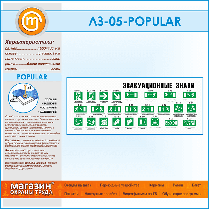 Предлагаем Вашему вниманию стенд, содержащий следующие эвакуационные знаки согласно ГОСТ 12.4.026-2015: