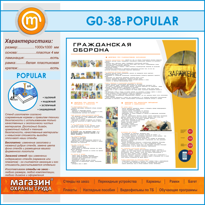 Стенд «Гражданская оборона» – это яркое исполнение необходимой информации по чрезвычайным ситуациям: действия при радиоактивном заражении, а также описание действий при внезапном обрушении зданий и сооружений, порядок действий при авариях со взрывами и пожарами