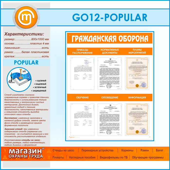 Стенд «Гражданская оборона» с 6 плоскими карманами (GO-12)