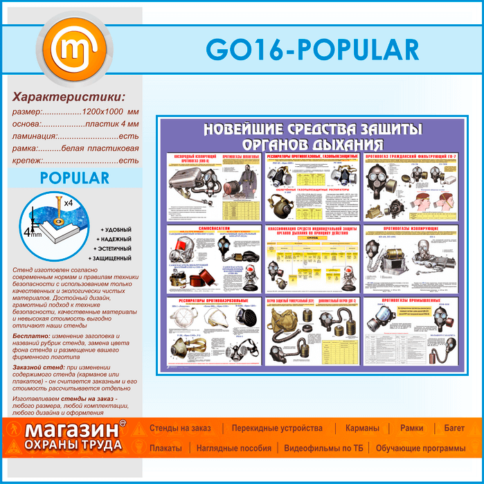 Стенд «Новейшие средства защиты органов дыхания» – полный перечень средств защиты СИЗ, с иллюстрациями, техническими характеристиками и описанием: кислородные изолирующие противогазы и шланговые противогазы, респираторы и газопылезащитные противогазы, подробная информация о гражданских противогазах и самоспасателях, приведено описание промышленных противогазов и противоаэрозольных респираторов…