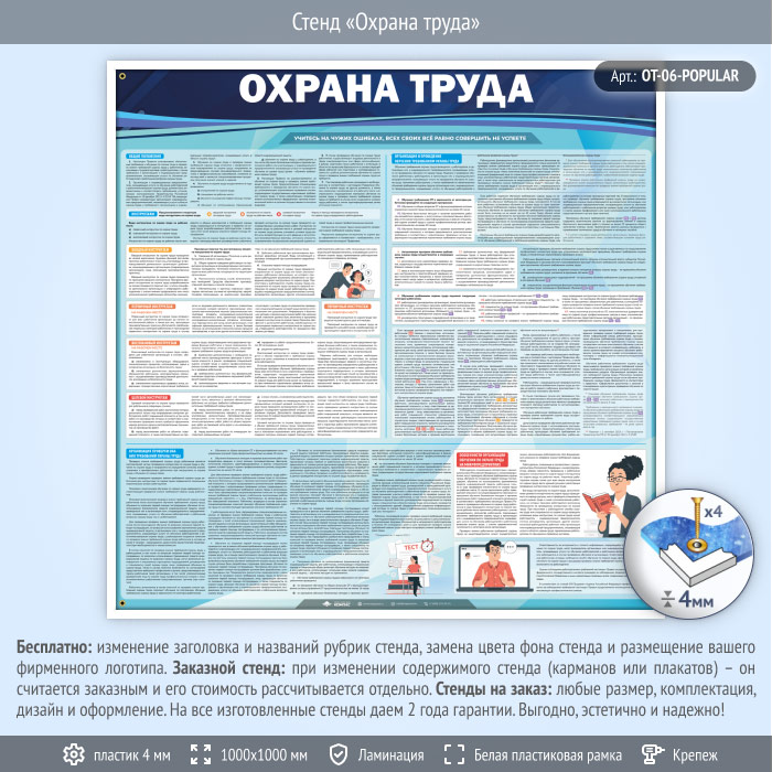 Стенд «Охрана труда» (OT-06) содержит порядок проведения всех видов инструктажей, информацию об организации и проведении обучения требованиям охраны труда, а также об организации проверки знаний и особенностях организации обучения по ОТ на микропредприятиях.