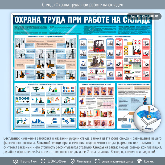 Стенд «Охрана труда при работе на складе» (OT-39) содержит ключевые рекомендации по безопасному выполнению погрузочно-разгрузочных работ, эксплуатации электропогрузчиков и электрических тележек, а также правила перемещения грузов вручную. Особое внимание уделено управлению профессиональными рисками и созданию безопасной рабочей среды. Стенд помогает минимизировать риски травматизма, обеспечить выполнение требований охраны труда и повысить культуру безопасности на складе.