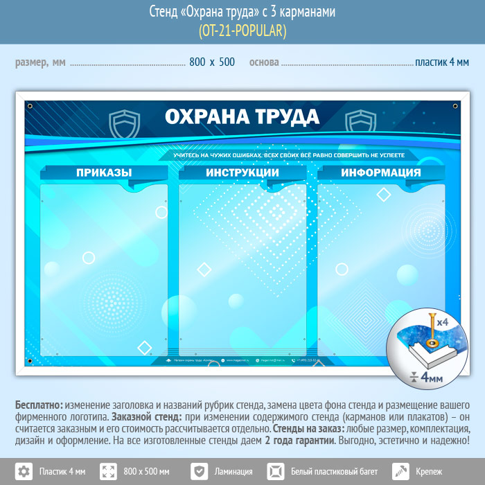 Стенд «Охрана труда» состоит из 3-х плоских карманов А4 формата книжной ориентации со следующими рубриками: приказы, инструкции, информация…