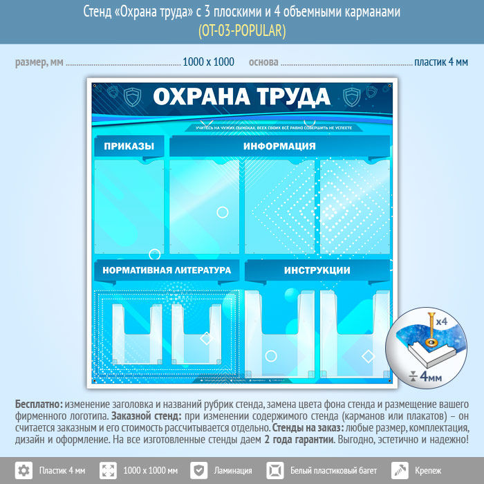 Стенд «Охрана труда» – стенд с карманами для самостоятельной комплектации: один плоский карман А4 формата для размещения инструкций, 3 плоских А4 кармана для информации по охране труда, два объемных кармана А5 формата под нормативную литературу и два объемных кармана А4 формата под инструкции…