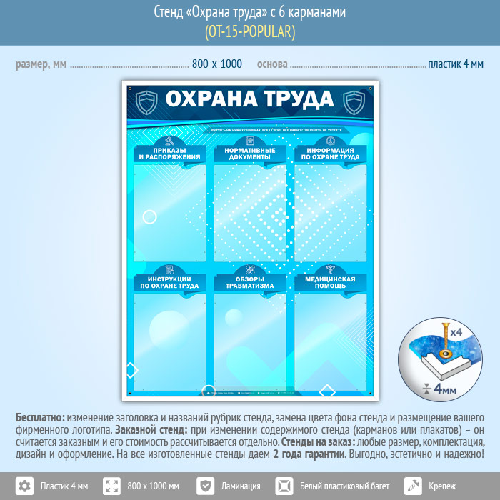 Стенд «Охрана труда» – это шесть плоских карманов А4 формата книжного расположения со следующими рубриками: приказы и распоряжения, нормативные документы, информация по охране труда, инструкции по охране труда, обзоры травматизма, медицинская помощь…