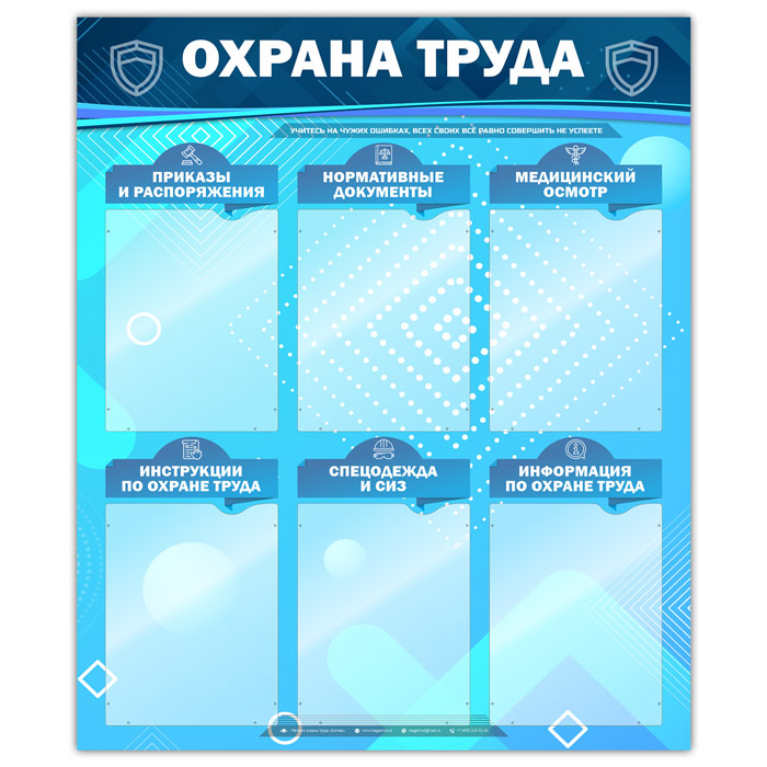 Стенд «Охрана труда» – это шесть плоских карманов А4 формата книжного расположения со следующими рубриками: приказы и распоряжения, нормативные документы, медицинский осмотр, инструкции по охране труда, спецодежда и СИЗ, информация по охране труда…